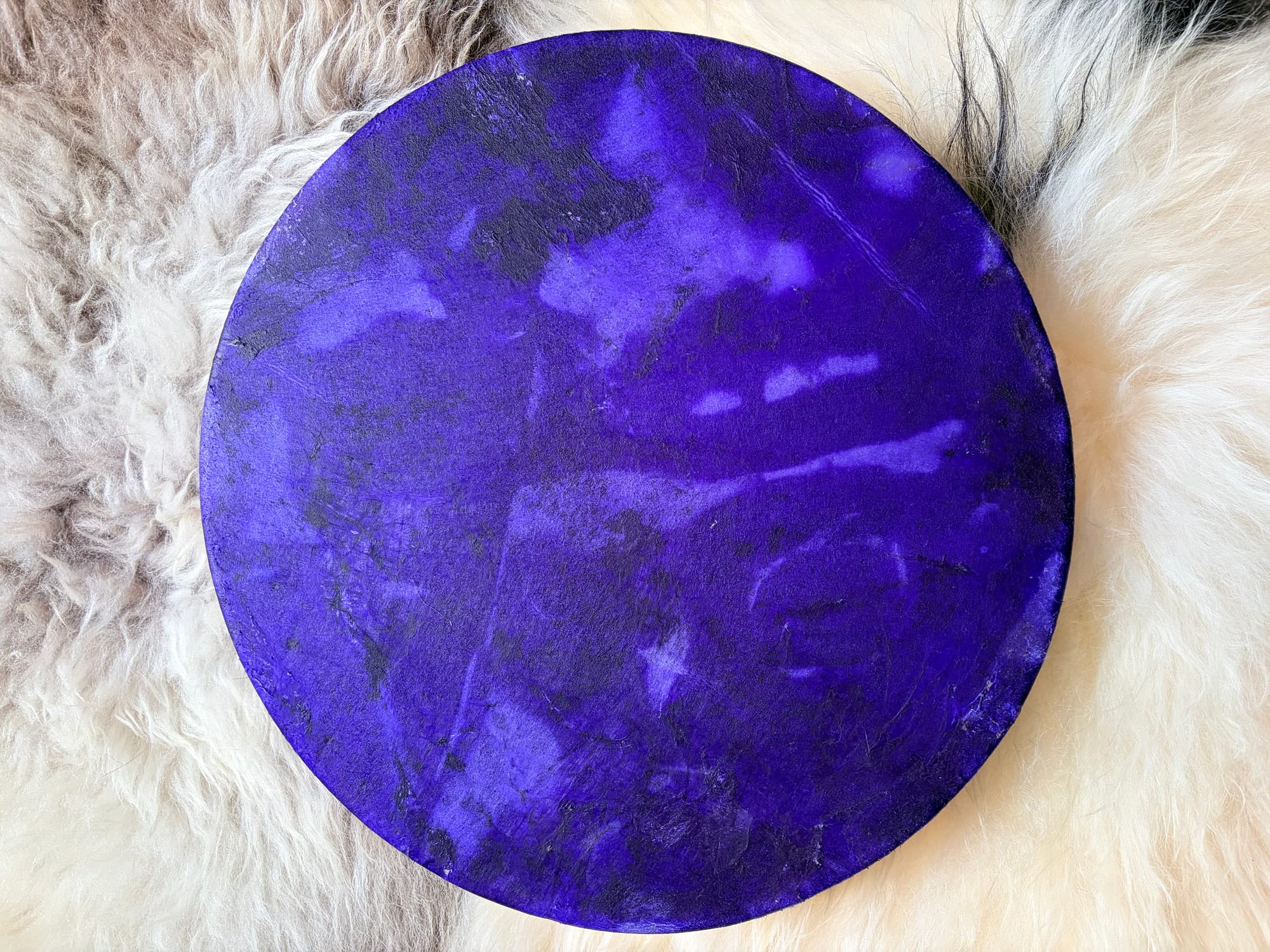 La Peau de Buffle Teinte en Mauve : Le Buffle est l'animal médecine de la Force Inébranlable, de l'Endurance et de l'Ancrage dans l'action. C'est une peau qui confère une résonance puissante et stable. La couleur Mauve est celle de la Spiritualité, de l'Intuition et de la Sagesse Divine, ouvrant le tambour aux plans supérieurs.