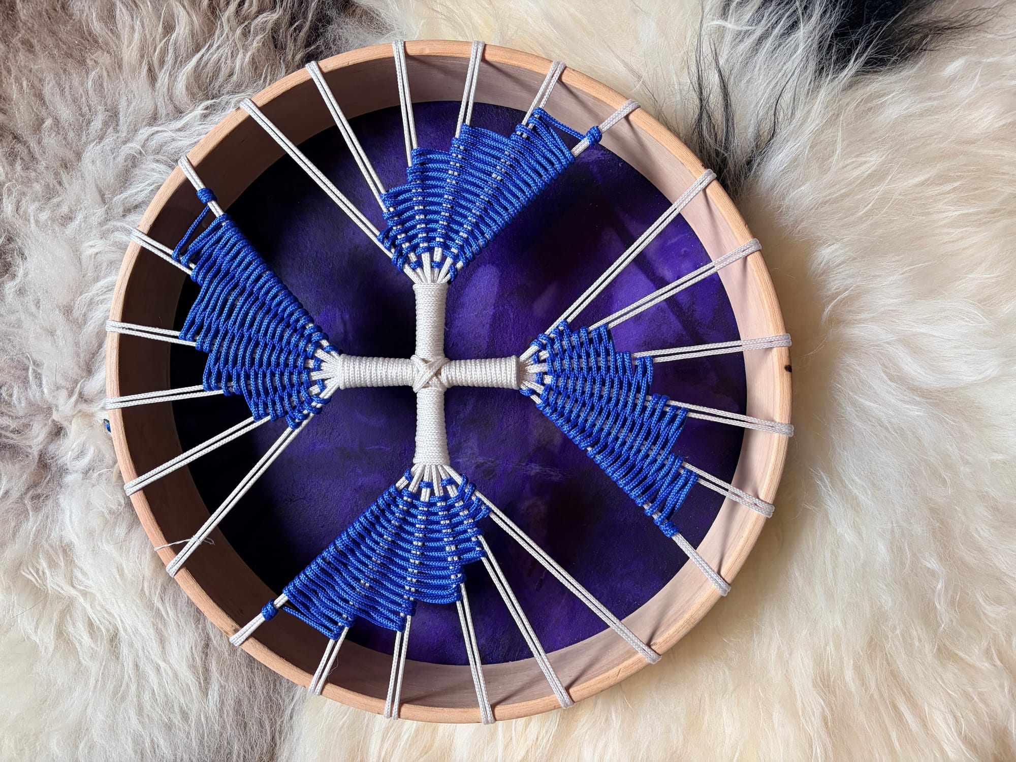 Le Tissage Bleu (Les Quatre Vents) : Le Bleu est la couleur de la Communication, de la Paix et du Ciel. Le motif central des Quatre Vents fait de ce tambour une boussole sacrée.