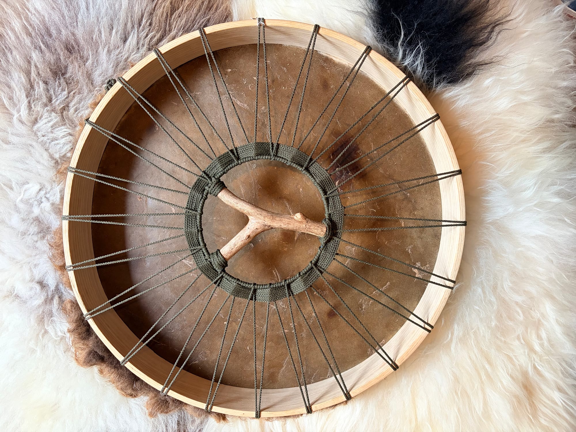Le Portail de la Force Verte (Cordage et Tissage) : Le cordage vert symbolise la croissance, la vitalité et l'énergie de guérison. Au centre, ce cordage vert forme un cercle parfait autour du manche en bois trouvé. Ce centre est le Portail de Force Verte : il est le point focal par lequel le rythme du tambour attire l'énergie brute et nourrissante de la Terre.