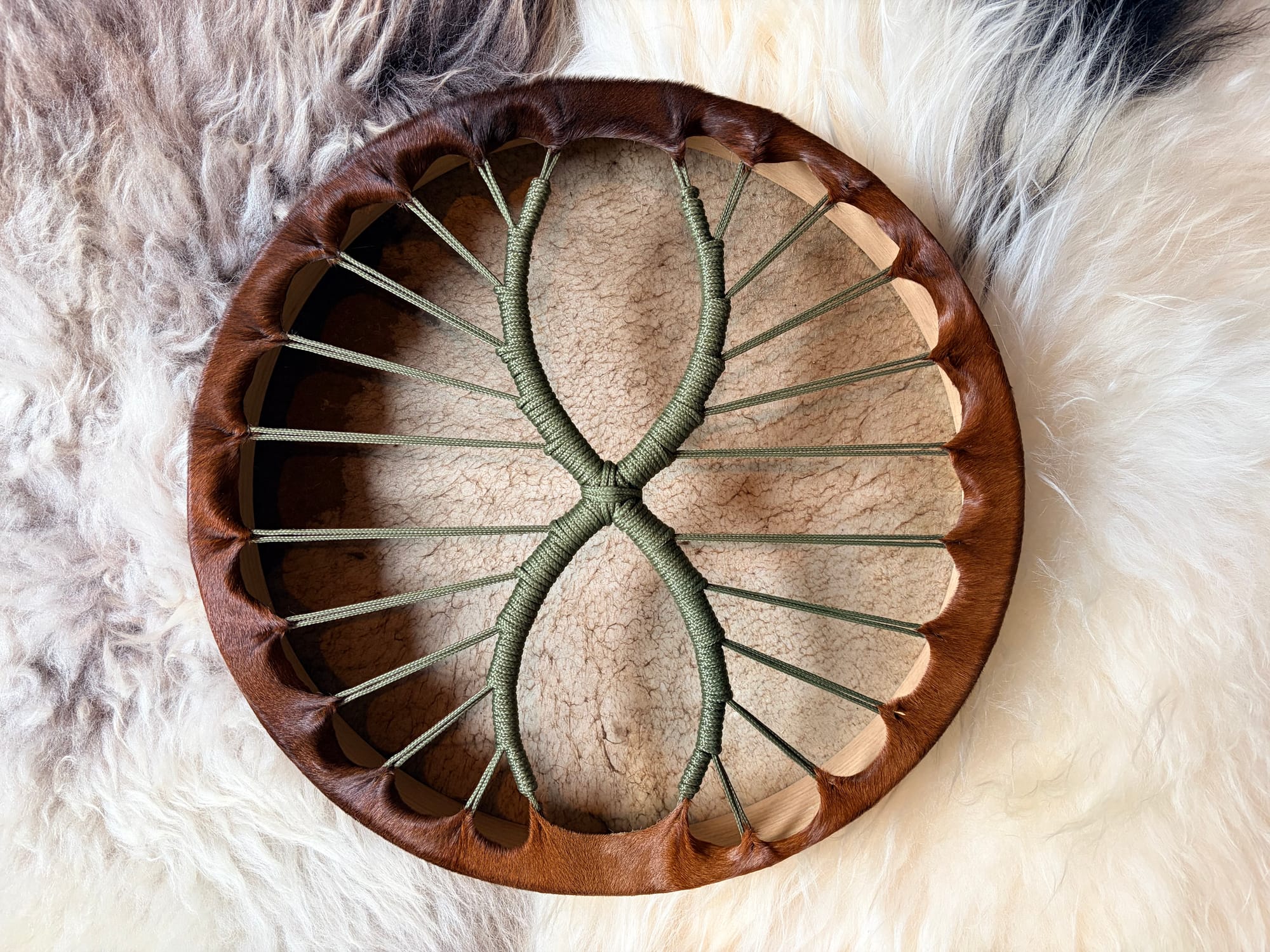 L'Harmonie du Vivant (Cordage Vert) : Le cordage vert symbolise la vitalité, la croissance incessante et le lien constant avec la Terre Mère. Il assure que l'énergie du tambour est toujours nourrie par la force guérisseuse de la nature.